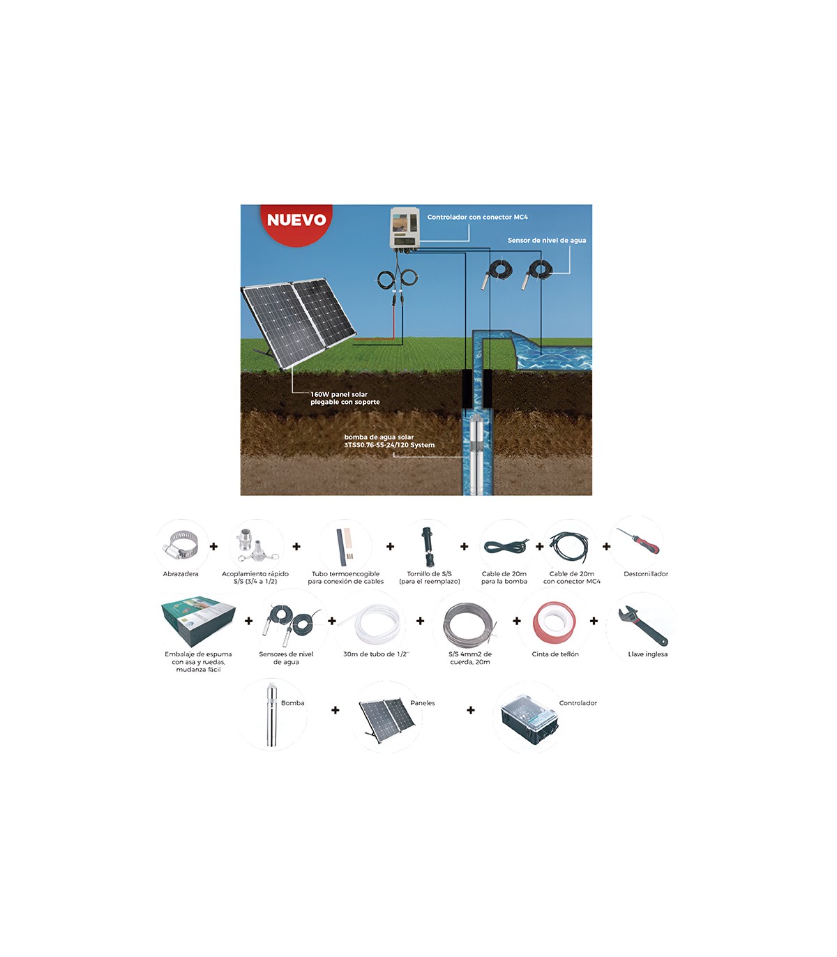 El sistema de bombeo solar es un producto ecológico con motor brushless DC de 3 fases de avance y tecnología MPPT y DSP para el controlador.