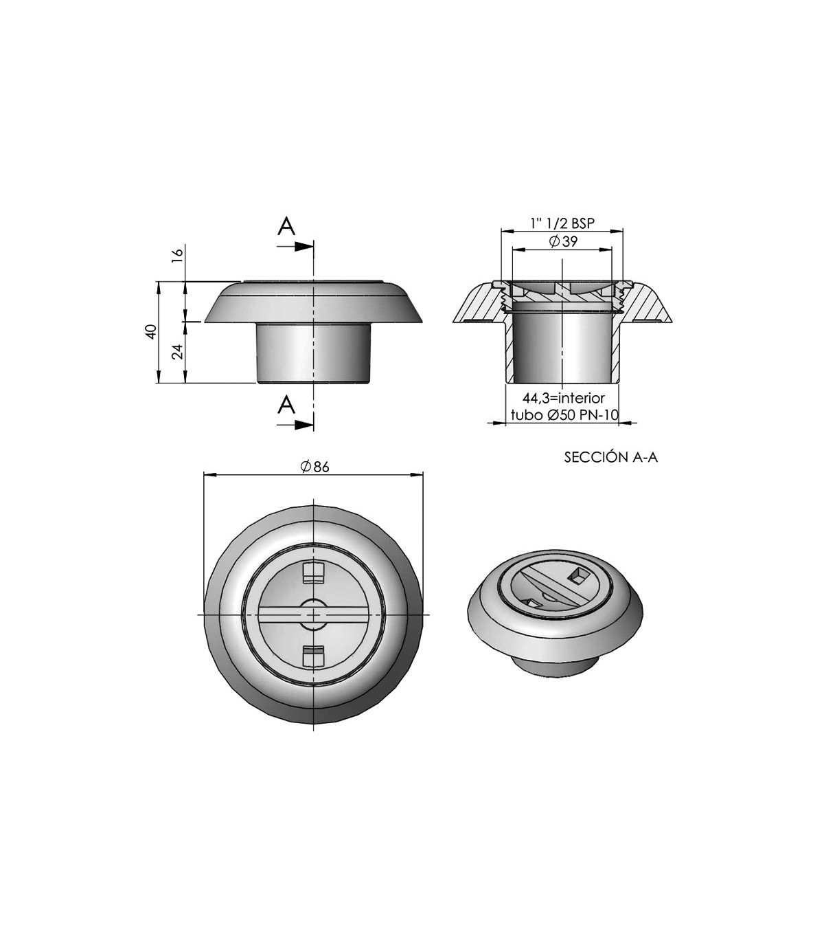 - Fabricada en ABS en color blanco con tapón rosca 1½".