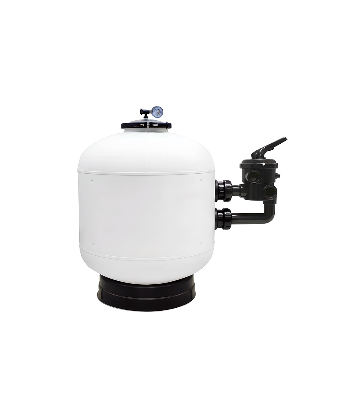 - Incluye manómetro, válvula selectora lateral de 6 vías y base para una perfecta estabilidad en su emplazamiento en el local técnico de la piscina.
