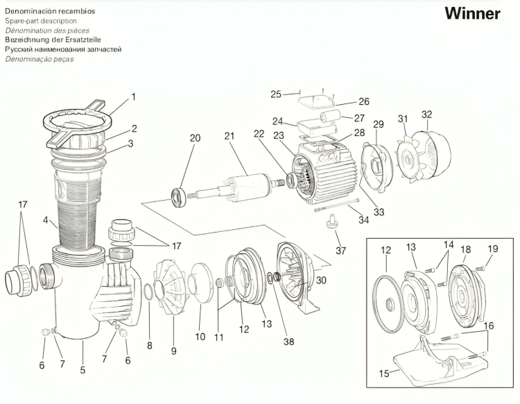 - Imposibilidad de comunicación eléctrica con el agua, ya que ninguna parte del motor tiene contacto con el líquido bombeado. Incorpora de serie llave para apertura de la tapa prefiltro sin esfuerzos, y kit rácores para encolar.