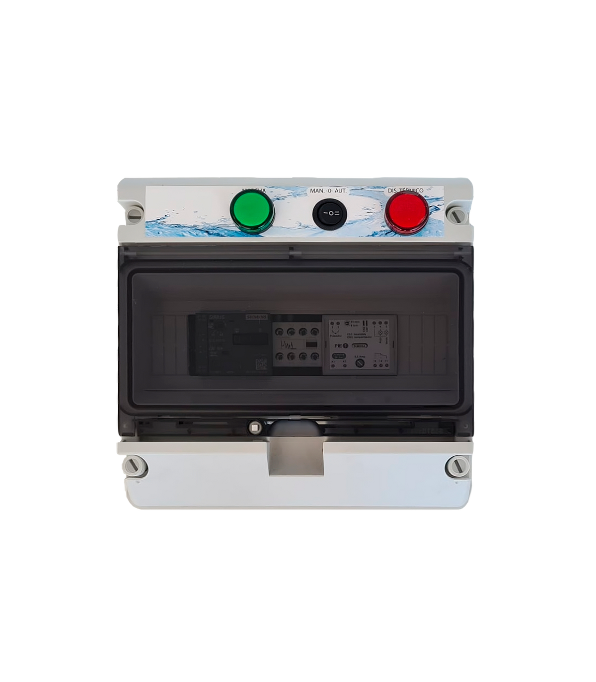 Cuadro de maniobra piezoeléctrico para controlar mediante la conexión de interruptor estanco colocado en la playa de la piscina, permitiendo la puesta en marcha paro de diferentes elementos como el funcionamiento de jacuzzis, spas, cascadas, o sistemas de piscinas que funcionen mediante bombas hidráulicas desde la zona de baño.