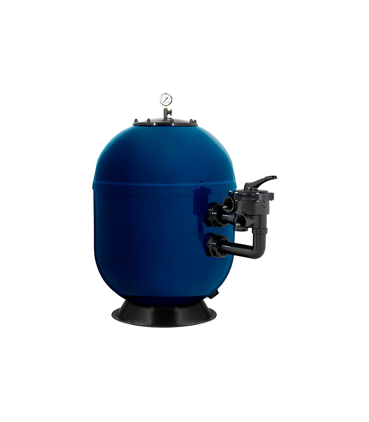 Filtro para piscina privada, fabricado con estándares industriales, tanque en fibra de vidrio reforzado, resistente a rayos UV. Incluye manómetro y válvula de 6 vías.