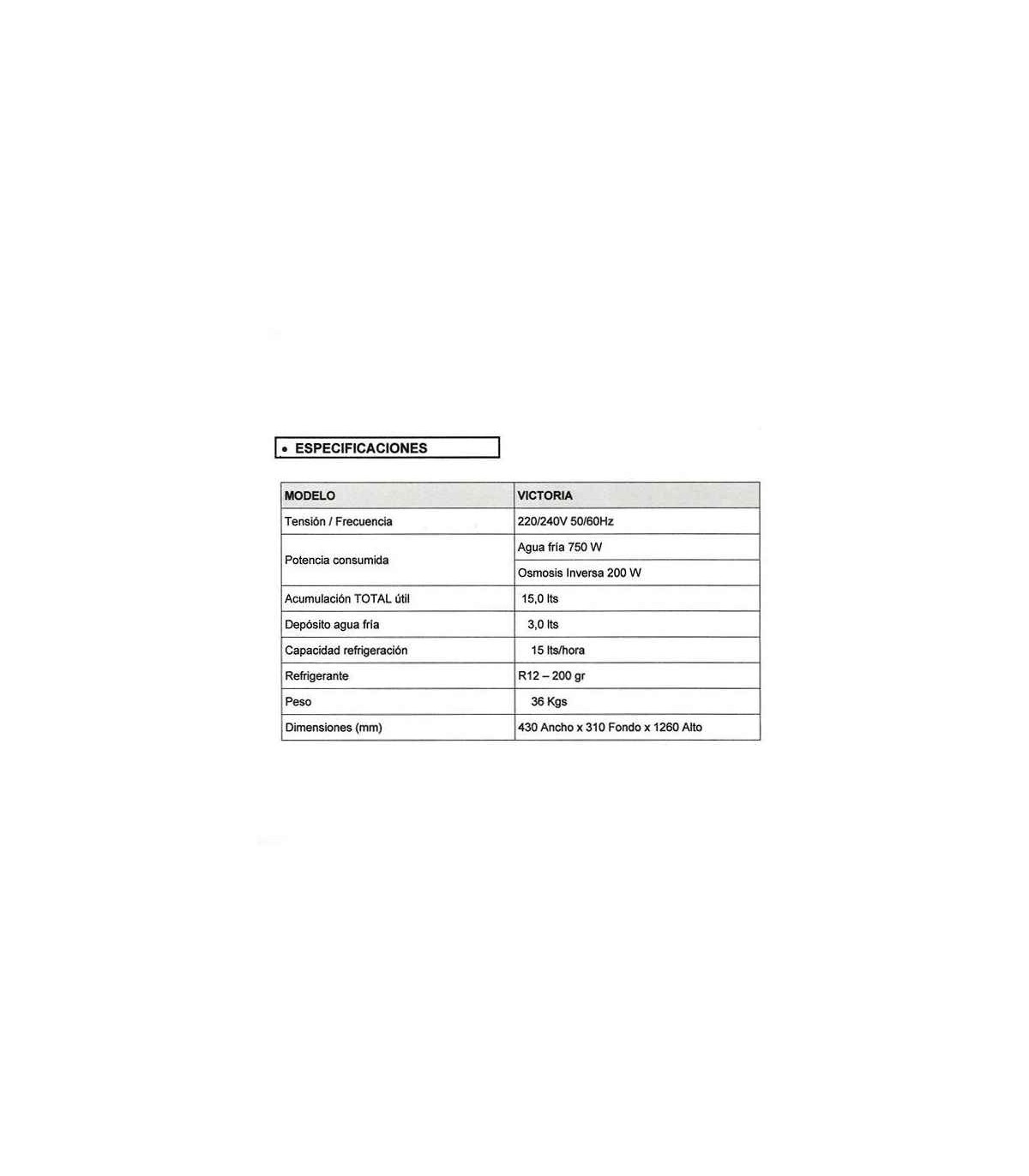 - Alimentación eléctrica: 220V/50Hz.